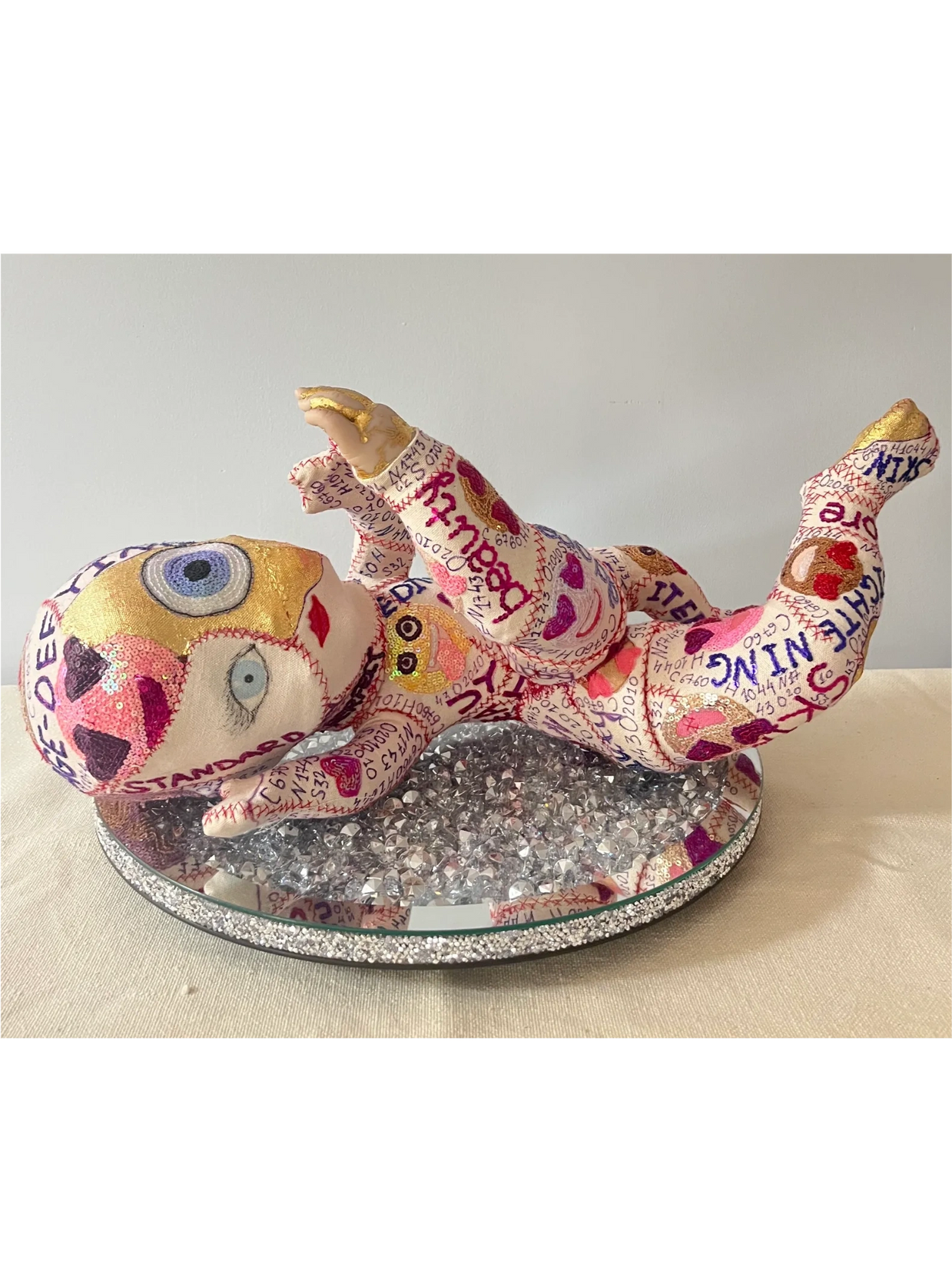 <!--fallen_beauty--> examines the convergence of pharmaceutical intervention, algorithmic marketing, and digitally imposed beauty standards. The sculpture depicts a hybrid infant figure reclining on a mirrored base encrusted with imitation crystal, evoking both cosmetic allure and artificial luxury. Its form is constructed from stitched and embroidered fabric densely inscribed with the chemical formula for onabotulinumtoxinA—commonly known as Botox—rendered in spiraling, hand-drawn script that wraps the body like a spell or prescription.